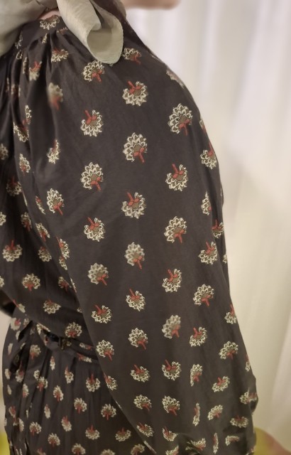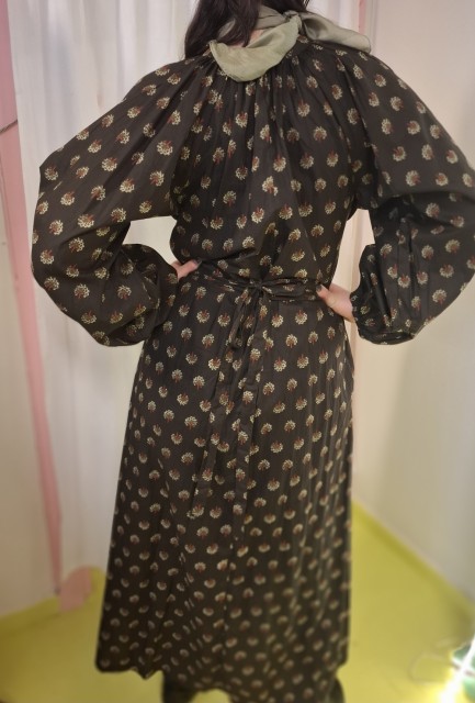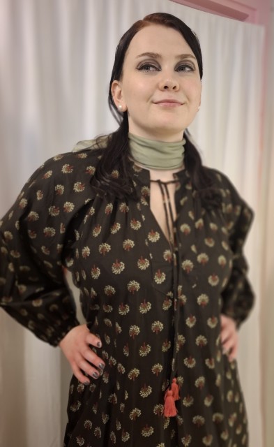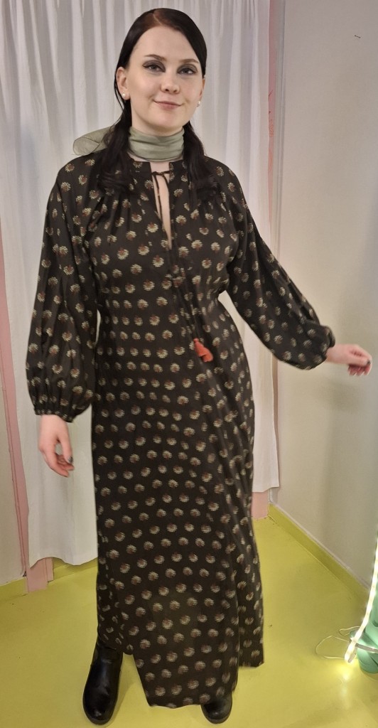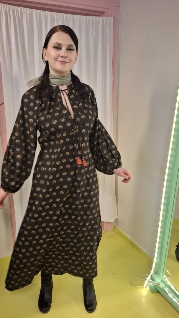Med luftige armer som som er lukket med strikk rundt håndledd, og snorer med dusk kan Astrid fort bli en favoritt! Stoffbeltet kan eventuelt bare knyttes bak. Fin med lang eller kort jakke over, eller en polo inni. Stoffet er trykket for Se min kjole. Romslig, gå gjerne ned en størrelse! Bomull, vask 30gr. Gjerne i pose / putetrekk så ikke snorer og dusker vikles for mye.